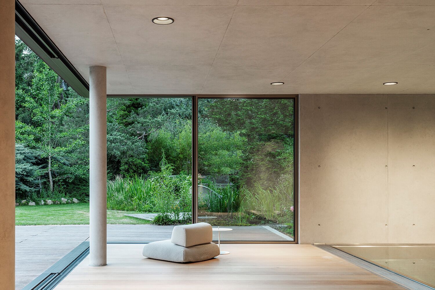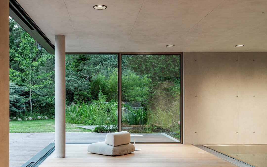 Der Eckpfosten ist nahtlos in den Rahmen des Schiebefensters integriert und gleitet beim Öffnen mühelos entlang der im Boden eingelassenen Edelstahl-Laufschiene. Diese technische Raffinesse ermöglicht es, gläserne Raumkanten einfach beiseite zu schieben – entweder manuell oder motorisiert – und den Wohnraum mit dem Garten zu vereinen.