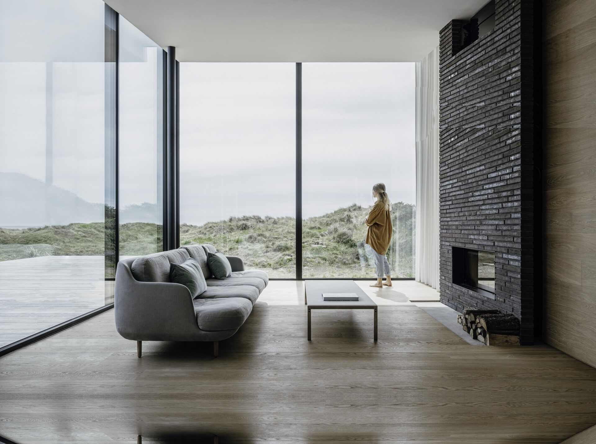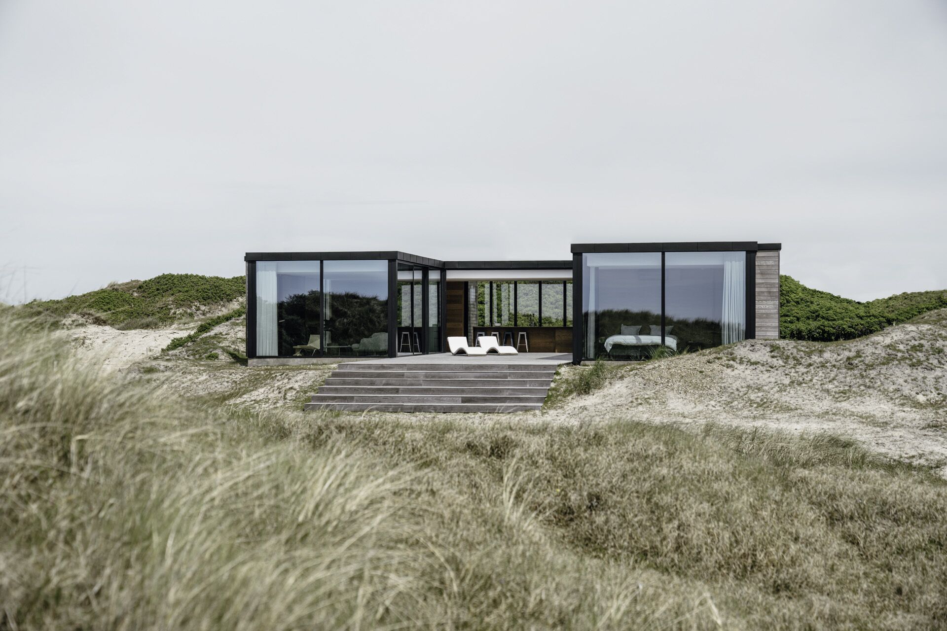 Das Haus wurde eingebettet in die unberührte Natur und bietet Platz für die gesamte Familie. Der Architekt ließ sich von den Sand- und Dünenlandschaften inspirieren und schuf ein Haus, das durch raumhohe Glasfronten die Naturschönheiten sowie das nordische Licht ungehindert ins Innere lässt. Bewegliche Glasfassaden ermöglichen es, die Grenze zwischen Innen- und Außenraum aufzuheben, während die Bewohner dennoch vor Blicken und Witterung geschützt sind.