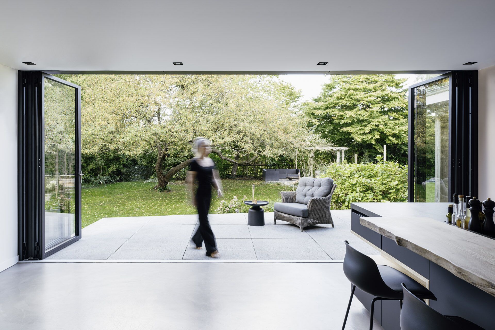 Die Glas-Faltwand von Solarlux lässt sich über die gesamte Breite öffnen und schafft eine nahtlose Verbindung zwischen innen und außen. Bildnachweis: Malik Pahlmann für Solarlux GmbH