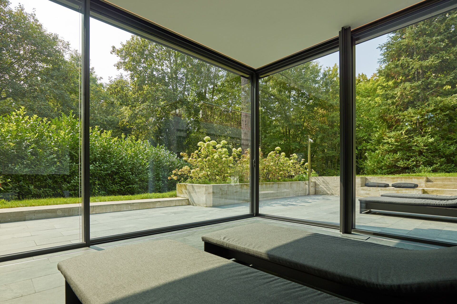 Das Maximal-Schiebefenster cero bietet einen großartigen Panoramablick ins Grüne. Bildnachweis: Tom Philippi für Solarlux GmbH